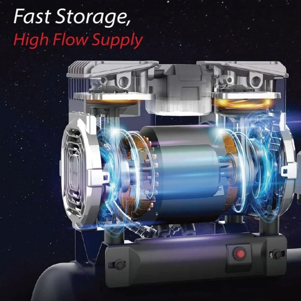 • Özel geliştirilmiş motor yapısı ve çift piston yapısı sayesinde rakiplerine kıyasla iki farklı piston başından hava üretimi doğrudan hava tankına basınçlı bir şekilde iletilir. Bu sayede hızlı hava üretimi sağlanır.