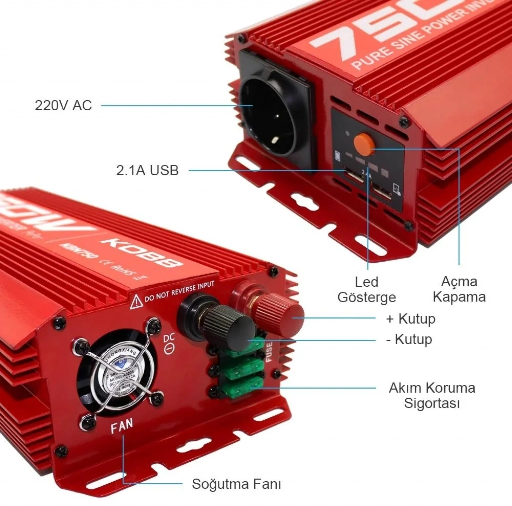 · KOBB KBN750 12V/220V 750Watt Tam Sinüs Dönüştürücü İnvertör