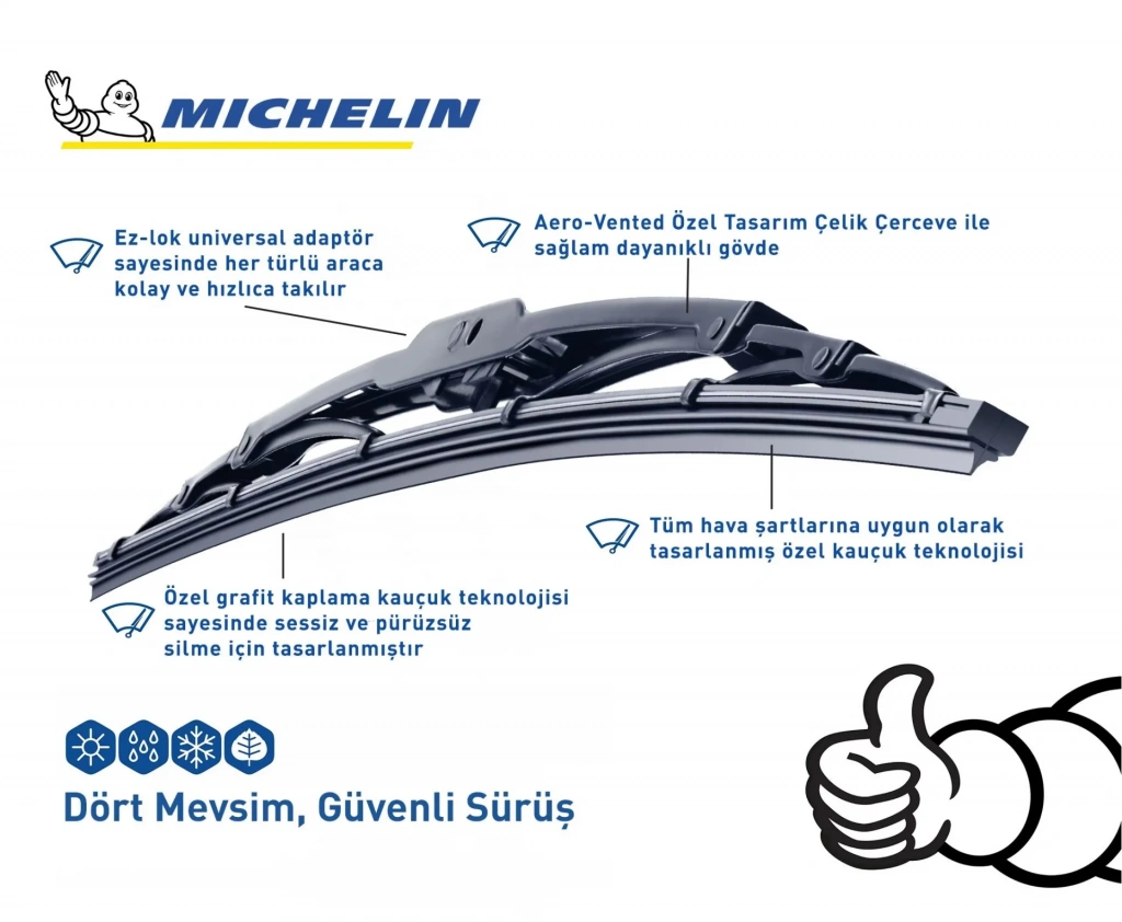 • Michelin sileceklerin içerisinde ekstra mukavemet sağlayıcı çelik teller, sileceklerin daha kusursuz olarak çalışmasını sağlar,