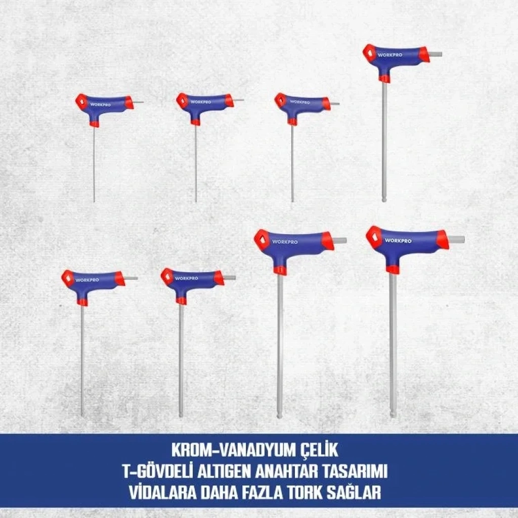 • WORKPRO WP200542 8 Parça CR-V Top Başlı T Tipi Uzun Profesyonel Allen Anahtar Takımı • Genel tamirat ve tadilat işleri ile her türlü mekanik veya elektrikli aletlerin bakım ve onarımında profesyonel olarak kullanılabilmesi için paslanmaya ve aşınmaya dayanıklı Krom kaplamaya sahiptir. • Geliştirilmiş dayanıklılık, paslanma direnci ve korozyon önleyici özellik için ısıl işlem görmüş CR-V çelikten yapılmış 8 Parçalı T tipi Allen anahtar setidir. • Yüksek kaliteli CR-V çelikten üretilmiştir, hassas ve ısıl işlemden sonra Allen uçları daha sert ve dayanıklı hale getirilmiştir. • Uzun boy Çelik CR-V şaft sayesinde dar ve derin alanlarda kolay kullanım imkânı. • Kauçuk kaplama T kol sayesinde rahat kavramanızı ve uzun süre yorulmadan çalışmanızı sağlar. • Top başlı Allen uç sayesinde cıvata başının eğik bir açıda bile rahatça vida veya cıvata başına oturmasını sağlar. Bu sayede dar alanlarda, özellikle erişilmesi zor noktalarda bile kolay ve etkili bir şekilde çalışma yapmanızı sağlar. • Ekstra güçlendirilmiş uzun Cr-V çelik şaft. • Dahili katlanabilir duvar askı aparatlı stant sayesinde Allen anahtar ölçü deliklerine takılarak düzenli kalmasını sağlar. • İÇERİK: • 2, 2.5, 3, 4, 5, 6, 8, 10mm Metrik T Tipi Allen Anahtar Seti