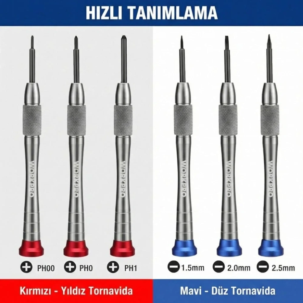 • WORKPRO WP200549 6 Parça Profesyonel S2 Manyetik Saatçi Tornavida Seti • Dizüstü bilgisayarlar, cep telefonları, tabletler, oyun konsolları ve diğer elektronik cihazların genel onarımı için uygundur. • Profesyonel olarak Mekanik veya her türlü elektrikli, elektronik aletlerinin bakım ve onarımları için paslanmaya dayanıklı yüksek S2 karbon çeliğinden üretilmiştir. • Geliştirilmiş dayanıklılık, paslanma direnci ve korozyon önleyici özellik için ısıl işlem görmüş S2 karbon çeliği ile üretilmiştir. • S2 Karbon çelik sayesinde uç sıyırmalarına karşı üstün dayanıklılık ve direnç sağlar. • Tepe noktasına entegre avuç içinde dönebilen renklendirilmiş oynar başlık sayesinde hassas vidalama yaparken avuç içini acıtmaz, üstün kontrol sağlar. • Şeffaf kapak sayesinde alet ve aksesuarları güvenli saklamanızı sağlar. • Parmak ucu kontrolü için krom kaplama gövde. • Vidalama uçlarına uygun renklendirilmiş oynar başlıklar sayesinde hızlı tornavida seçimi yapmanızı sağlar. • Yüksek kaliteli S2 çelik kullanılmıştır, hassas ve ısıl işlemden sonra vidalama uçları daha sert ve dayanıklı hale getirilmiştir. • Yivli gövde sayesinde parmak uçları tornavidayı daha iyi kavramanızı sağlar. • İÇERİK: • SL1.5 / SL2.0 / SL2.5mm Düz Saatçi Tornavida • PH00 / PH0 / PH1 Yıldız Saatçi Tornavida • Şeffaf Taşıma Çantası