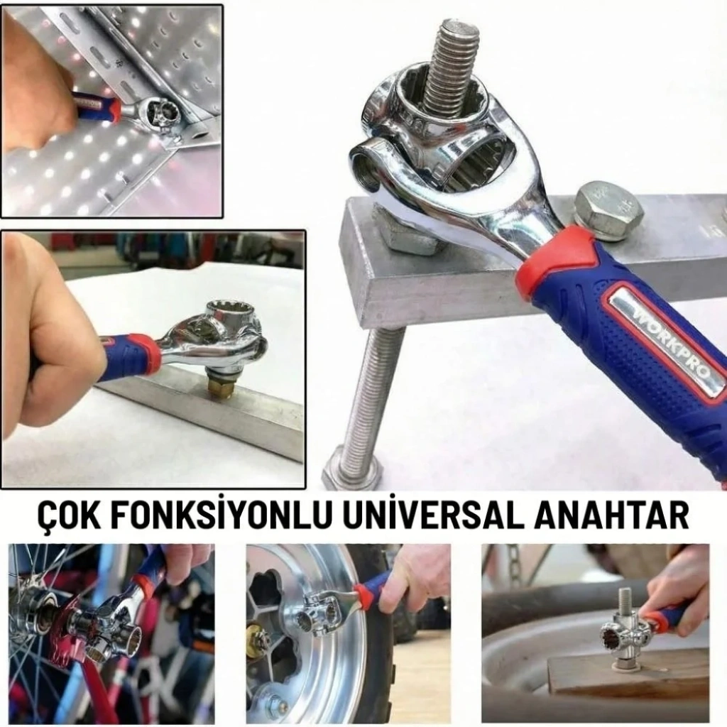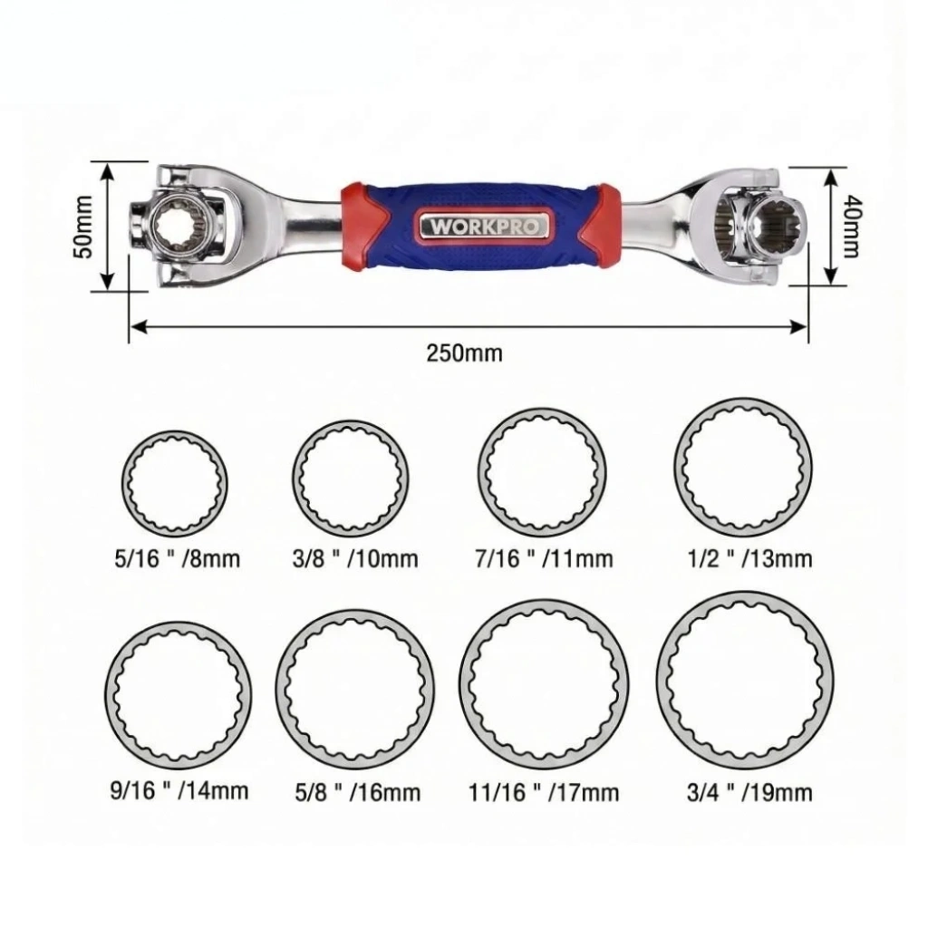 • WORKPRO WP272018 8 IN 1 Mafsallı Çok Fonksiyonlu Profesyonel Lokma Anahtarı • 8mm(5/16″), 10mm(3/8’’), 11mm(7/16″), 13mm(1/2″), 14mm(9/16″), 16mm(5/8″), 17mm(11/16″), 19mm(3/4″) Dönebilir/mafsallı 8 farklı ölçülerdeki başlıklar ile genel ve çok amaçlı kullanım sağlar. • Otomotiv, genel tamirat ve tadilat işleri ile her türlü mekanik veya elektrikli aletlerin bakım ve onarımında profesyonel olarak kullanılabilmesi için paslanmaya ve aşınmaya dayanıklı dövme çelikten üretilmiştir. • Profesyonel işlerde özel olarak geliştirilmiş dayanıklılık, paslanma direnci ve korozyon önleyici özellik için ısıl işlem görmüş CR-V çelikten üretilmiş 8 Parçalı metrik mafsallı lokma anahtarı ile profesyonel kullanım imkânı sağlar. • Yüksek kaliteli dövme çelik kullanılmıştır, hassas ve ısıl işlemden sonra mafsallı lokmalar ve ana gövde daha sert ve dayanıklı hale getirilmiştir. • 360° dönebilen mafsal mekanizması ve yıldız lokmalar sayesinde 6 farklı cıvata ve somunlara uyum sağlayarak geniş kullanım alanı sunar. • Kauçuk kaplı tutma sapı sayesinde avuç içi terlemez, rahat tutuş sağlar. • Ölçeklendirilmiş metrik ve inç ölçekli kabartmalı lokma mafsalları uygun lokma seçimi yapmanızı kolaylaştırır. • Lokma Ölçüleri; • 8mm(5/16″), 10mm(3/8’’), 11mm(7/16″), 13mm(1/2″), 14mm(9/16″), 16mm(5/8″), 17mm(11/16″), 19mm(3/4″)