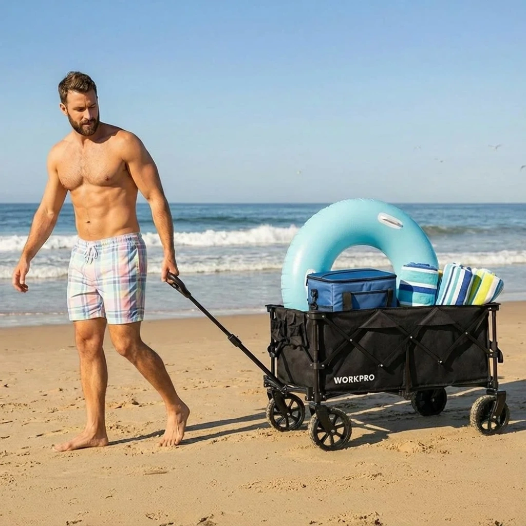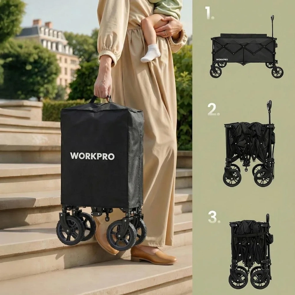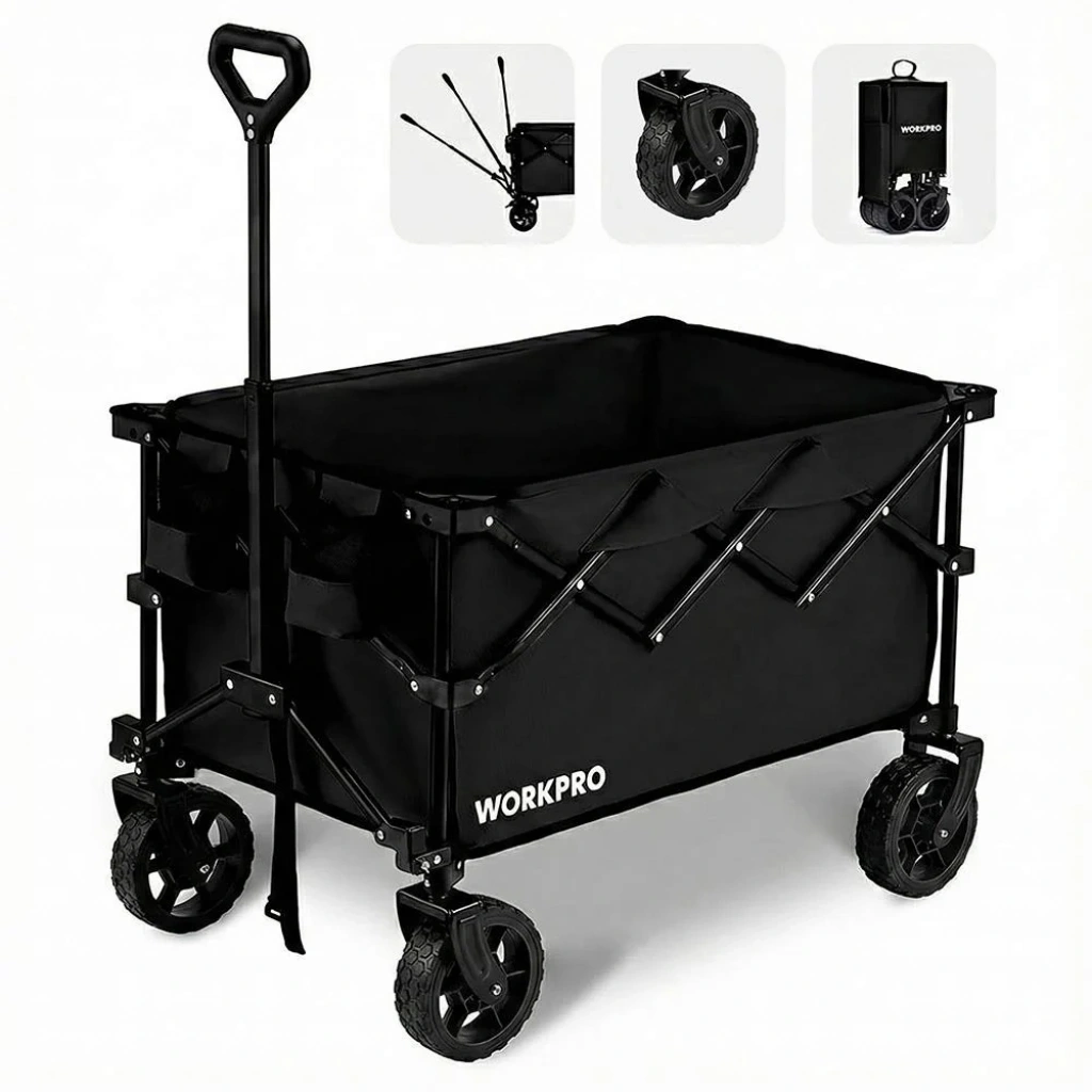 • WORKPRO WP285015 80Kg 4 Tekerli Katlanabilir Ağır Hizmet Taşıma Arabası • Alışveriş arabası olarak kullanılmasının yanı sıra plaj, park, kamp, açık hava spor etkinlikleri, top veya ekipman taşıma, bahçe eşyaları ve malzemeleri taşımak için dayanıklı 600D Polyester kumaş ve çelik akordiyon gövdeden üretilmiştir. • Katlanabilir dört tekerlekli ağır hizmet tipi yapısı ile güvenilir taşıma performansı sunar. • 360 derece dönebilen ve kilitlenebilir ön PU tekerler sayesinde düz veya engebeli yüzeylerde kolay sürüş imkânı sağlar. • Saniyeler içinde açılıp katlanabilen özel hafif yapısı ile her an kullanıma hazırdır. • Teleskobik D saplı çekme sapı boyunuza göre ayarlanarak konforlu sürüş imkânı sağlar. • U: 85 x G:50 x D:37cm 157Lt. Vagon hacmi ile 80kg’a kadar ağır veya hacimli kaba eşyaların taşınmasında üstün kolaylık sağlar. • Kilitlenebilir ince yüzeyli tekerler sayesinde düz ve çakıl yollarda zahmetsiz ve kolay sürüş sağlar. • Vagon üzerine entegre şişe tutucu fileli cep sayesinde düzenli bir kullanım deneyimi ve hızlı erişim sunar. • Taşıma kılıfı sayesinde kapatıldıktan sonra yer kaplamaz, güvenle muhafaza etmenizi ve kolay taşımanızı sağlar. • Taşıma Kapasitesi: 80kg. • Açık Ölçüler: Uzunluk: 85cm / Genişlik: 50cm / Derinlik: 37cm • Kapalı Ölçüler: 30 x 22 x 63 cm
