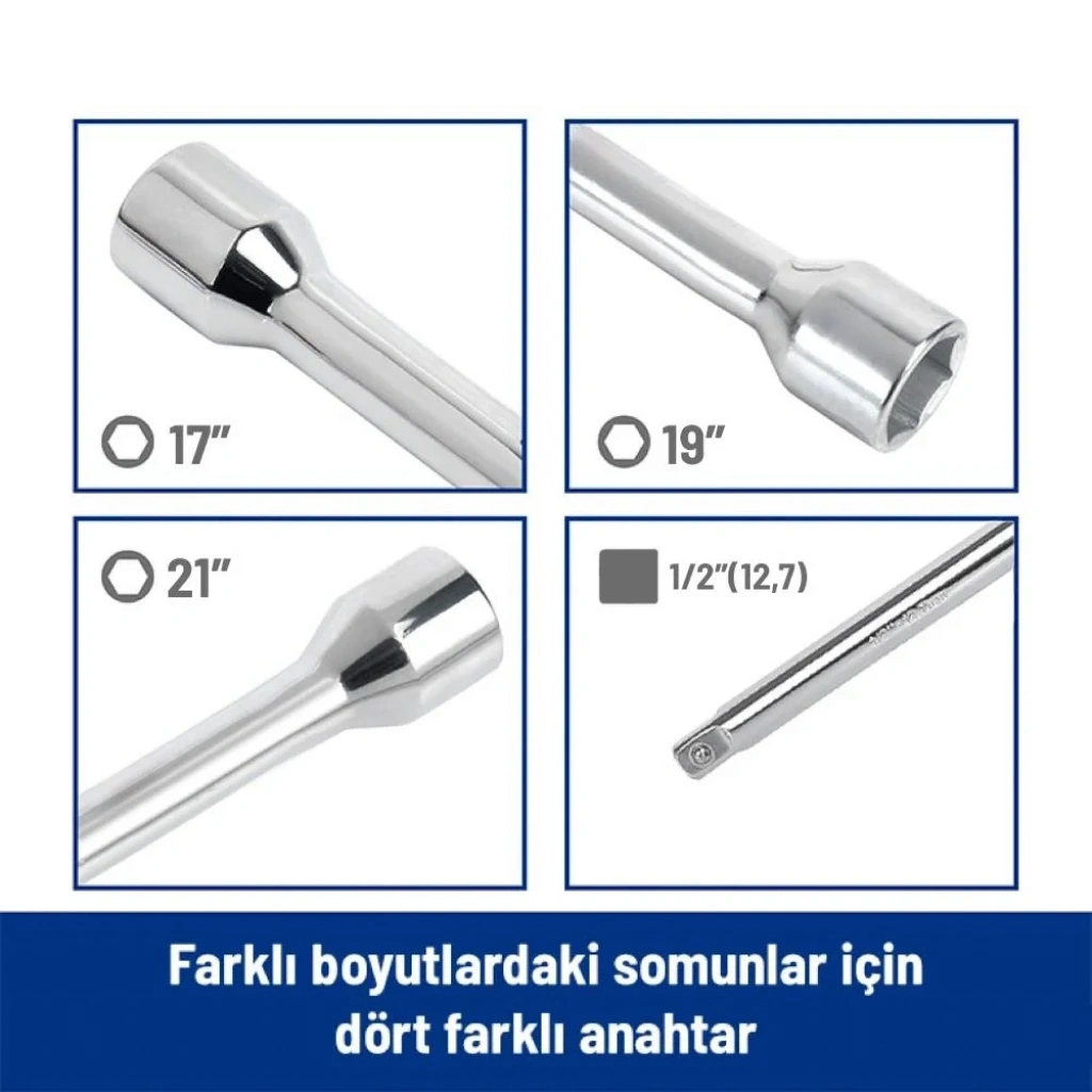 • WORKPRO WP314006 17 19 21 1/2’’ Cr-V 400mm 4 Kollu Profesyonel Bijon Anahtarı • Otomotiv araç lastik değişimlerinde, somun veya cıvataların sıkılıp sökülmesinde profesyonel olarak kullanılabilmesi için paslanmaya, aşınmaya ve yüksek mukavemete dayanıklı dövme çelik Krom Vanadium dan üretilmiştir. • Yüksek kaliteli Cr-V dövme çelik kullanılmıştır, hassas ve ısıl işlemden sonra bijon anahtar ağızları ve ana gövde daha sert ve dayanıklı hale getirilmiştir. • 4 kollu yüksek mukavemete dayanıklı kaynak tasarımı sayesinde zahmetsizce bijon somunlarını sökmenize yardımcı olur. • 1/2'’ lokma girişli soket ile istenilen lokma takılarak uygun bijonları veya somunları sıkmanızı/sökmenizi sağlar. • 17 – 19 – 21 – 1/2'’ Bijon veya Somunlarda Kullanıma uygundur. • Boyutlar: 400mm x 400mm