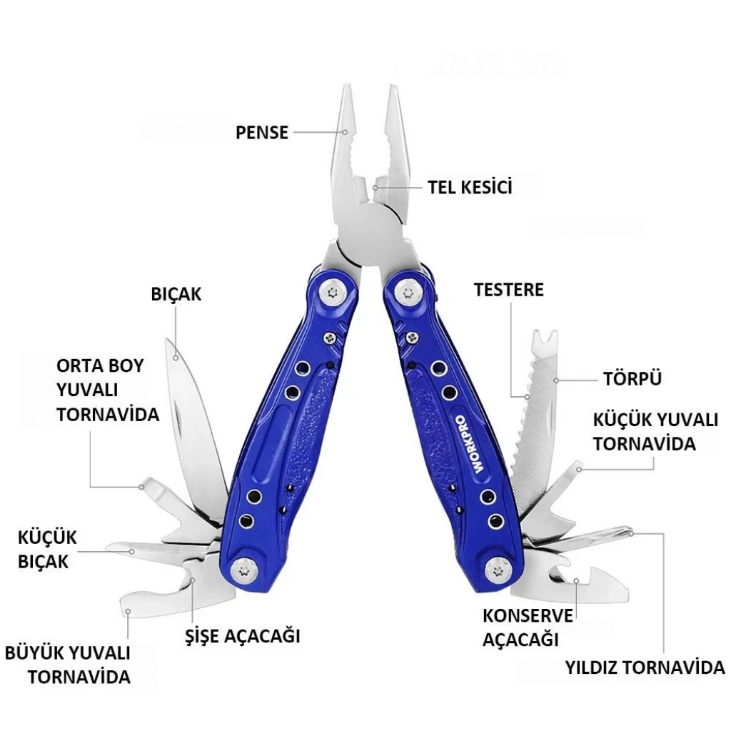 • Pense, Bıçak, Mini Çakı, Çatal Tornavidalı Eğe, Yıldız Tornavida, Düz Tornavida, Mini Testere, Gazoz/Konserve Açacağı gibi birçok kullanım alanı sayesinde tek bir alet ile 15 farklı kullanım sağlar.