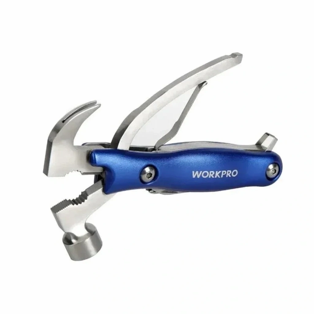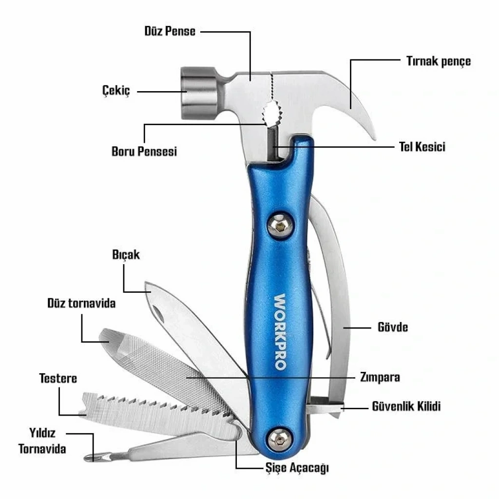 • WORKPRO WP382018 12 IN 1 Çok Fonksiyonlu Profesyonel Çekiçli Pense Seti • Sanayi, İnşaat, Otomotiv, Kamp, Avcılık, Acil durum, mekanik veya her türlü aletlerinin bakım ve onarımlarında profesyonel olarak ve uzun ömürlü kullanım için dayanıklı ve hafif Alüminyum çerçeve ve 2CR13 paslanmaz dövme çelik malzemeden üretilmiştir. • Kancalı Çekiç, Burunsuz Pense, Bıçak, Tornavida, Eğe, Mini Testere, Gazoz Açacağı gibi birçok kullanım alanı sayesinde tek bir alet ile 12 farklı kullanım sağlar. • Alüminyum tutma saplı dayanıklı paslanmaz dövme 2CR13 çelikten üretilmiş uzun ömürlü sağlam yapı. • Kablo kesici çapraz dişler sayesinde kablo vb. malzemelerin kesilmesine yardımcı olur. • Burunsuz düz kavrama pensesi ve tırtıklı diş yapısı sayesinde kolay kavrama sağlar. • Kilitlenebilir katlanır fonksiyonel aksesuarlar ile güvenli kullanım imkânı. • Yüksek kaliteli paslanmaz dövme çelik kullanılmıştır, hassas ve ısıl işlemden sonra Pense ve uçları ve diğer aksesuarlar daha sert ve dayanıklı hale getirilmiştir. • Çekiç başı ve çivi çıkarma kancası ile hızlı ve kolay çivi çıkarmanızı sağlar.