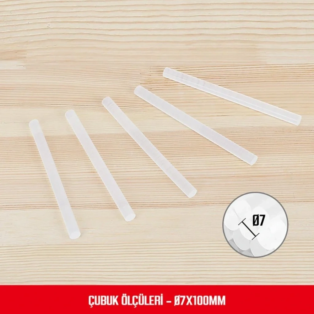 • WORKPRO WP432001 7x100mm Sıcak Silikon Tabancası İçin 100 Adet Şeffaf Yedek Silikon/Mum • Hobi amaçlı maketler, süslemeler, kâğıt, deri, kumaş, ahşap, mobilya parçaları yapıştırma işleri, kablo sabitleme gibi birçok alanda iki malzemenin birbirine yapıştırılarak sabitlenmesinde kullanılan yüksek viskoziteli kokusuz şeffaf silikondur. • 7mm çapındaki tüm sıcak mum/silikon tabancaları ile kullanıma uyumlu üniversal şeffaf kokusuz silikon. • Çap: 7mm ⌀ • Boy: 10cm