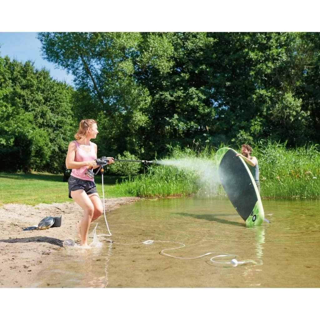 · Tabanca üzerindeki güçlü motor ve piston mekanizması ile şebeke suyundan, havuzdan, akarsudan, kovadan ve hatta pet şişeden 1,5m yüksekliğe kadar otomatik olarak direk emiş yaparak 24 Bar’a kadar basınç sağlayarak Araba, Motosiklet, Bisiklet, ATV, Karavan veya bahçe aletlerinizi, masa ve sandalyelerinizi, veranda gibi yüzeyleri basınçlı tazyik oluşturarak temizlemenizi sağlar.
