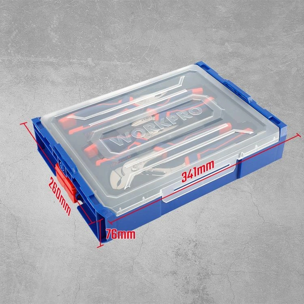 • WORKPRO WP209133 4 Parça Profesyonel Pense Seti • 200mm Kombine Pense, 160mm Yan Keski, 160mm Kargaburnu ve 250mm Ford Pense olmak üzere 4 parçadan oluşmaktadır. • Sanayi, İnşaat, Otomotiv, Şantiye, Acil durumlar gibi mekanik veya her türlü elektrikli, elektronik aletlerin bakım ve onarımlarında profesyonel ve uzun ömürlü kullanım için aşınmaya ve paslanmaya dayanıklı Ni-Fe alaşımlı paslanmaz dövme karbon çelik malzemeden üretilmiştir. • Yüksek kaliteli Ni-Fe dövme karbon çelik kullanılmıştır, hassas ve ısıl işlemden sonra kesme ve kavrama dişleri daha sert ve dayanıklı hale getirilmiştir. • Pense uçları ve kesici dişler yüksek baskı mukavemetli modifiye edilmiş dövme karbon çelikten üretilmiştir. • 250mm Fort Pense hızlı ve kolay sıkma, sökme yapmanızı sağlar. • Ni-Fe alaşım, pas ve korozyon gibi dış etkenlerden koruyarak uzun ömürlü yapı kazandırır. • %30 daha geniş Üst düzey kauçuk kaplama sap tasarımı kaymayı önler, el yorgunluğunu azaltır. • Özel tasarım plastik muhafaza ve taşıma çantası ile aletlerinizi temiz ve güvenli bir şekilde saklamanıza imkân sağlar. • Özel tasarlanmış kilitli taşıma çantası sayesinde birden fazla aynı çantayı üst üste koyup kilitleme mekanizması ile güvenle taşımanıza imkân sağlar.